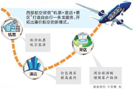 廉價航空如何構建自己的商業生態?這是宣布轉型低成本后的西部航空的一大難題。昨日,商報記者獲悉,為打開局面,西部航空宣布拉長產業鏈,進軍旅游市場,將重點打造“機票+酒店”的組合旅游模式,探路低成本航空運作商業生態鏈。這意味著西部航空的盈利觸角,將延伸到下游的在線旅游市場。對此,在線旅游服務企業表示,歡迎航空公司打包產品通過他們來銷售,但航空公司若想壟斷資源來搶食,恐不受歡迎。