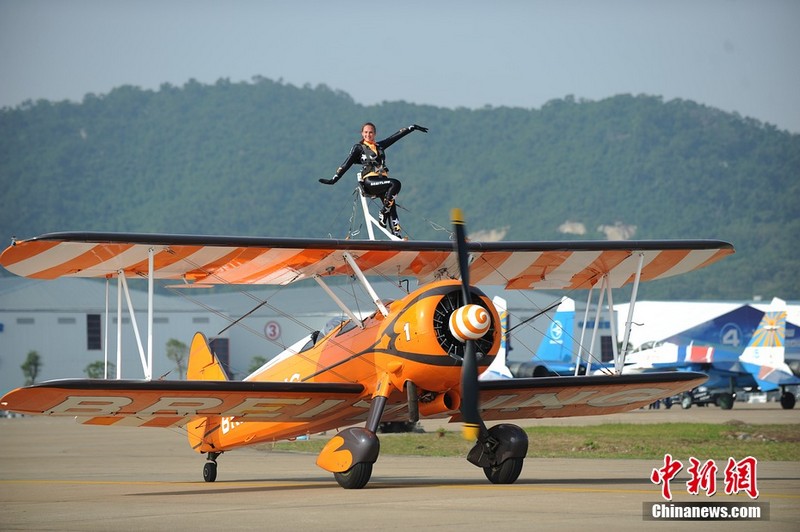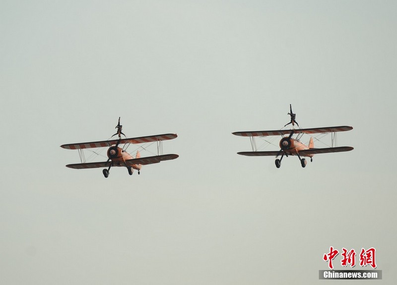 11月11日下午,歐洲“百年靈”機翼行走飛行表演隊表演了精彩的“云中漫步”。兩架飛機上各站有一名美女,在空中表演獨門舞步和雜技,隨飛機一起“云中漫步”,優雅精準。