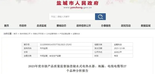 2023年度鹽城市市場監督管理局委托南京市產品質量監督檢驗院(南京市質量發展與先進技術應用研究院)組織實施家用燃氣具產品市級監督抽查。本次抽查計劃10批次,抽到10批次,經檢驗合格10批次。