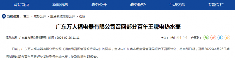 日前,廣東萬人福電器有限公司按照《消費(fèi)品召回管理暫行規(guī)定》的要求,主動向廣東省市場監(jiān)督管理局報(bào)告了召回計(jì)劃,將自即日起,召回2022年4月26日期間制造的部分百年王牌WA-15A型號電熱水壺,涉及數(shù)量為1560臺。